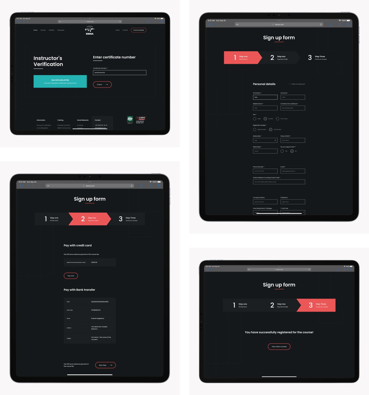 Our redesign focused on enhancing user functionality with streamlined course viewing and purchasing, and efficient verification of documents and instructor credentials. This transformation aimed to align the website's functionality and design with EBSSA's current global stature.